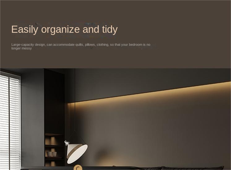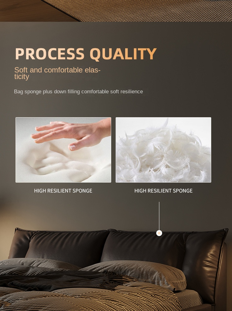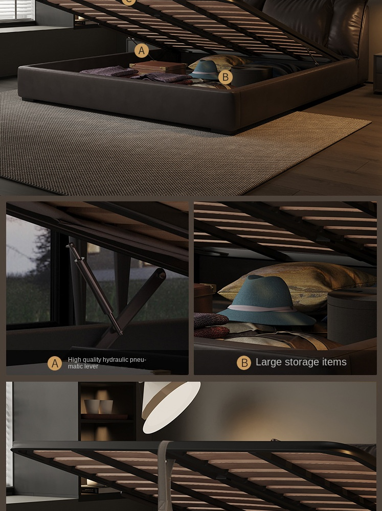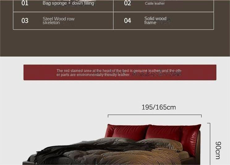 DetailDoes it have storage space? YesLeather material: Head layer cowhideStyle: Italian minimalismLeather finishing process: Lacquer finishFurniture Structure: Frame StructureSpace: BedroomAdditional function: High box storageTarget audience: AdultsFunction: DisassemblyDo you have a 3D model? NoMaterial: Solid woodDesign element: Master designStyle details: Leather splicing